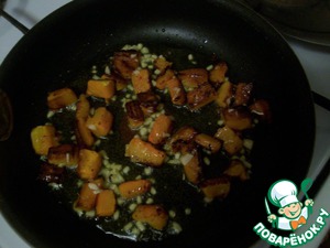 Разогреваем на сковороде оставшиеся 4 ст. л. масла, выкладываем запеченную тыкву. Практически сразу выкладываем чеснок, аккуратно перемешиваем.