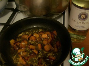 И сразу вливаем белое сухое вино, наполовину выпариваем.