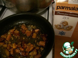 Пока запекается тыква, необходимо отварить пенне до состояния аль денте. Также нужно мелко нарезать чеснок.