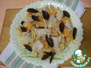 В это же время отвариваем филе рыбы (15 минут), затем аккуратно разделяем на кусочки.