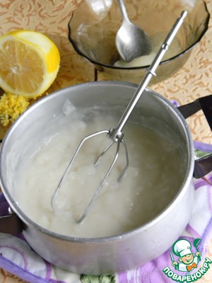 К этой массе добавить горячее молоко, и проварить, пока не загустеет. Снять с огня и остудить. Желатин растворить в лимонном соке (3ст. л), и оставить до набухания. Затем растопить, не кипятить!!!. Аккуратно ввести в заварной крем