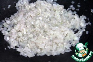 Сначала готовим соус. В глубокой сковороде пассируем лук в оливковом масле. Когда он уже стал мягким, добавляем чеснок (его пропускаем через чеснокодавилку) и 2 ст. л. винa. Готовим, помешивая, до полного испарения вина.