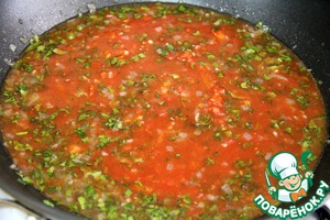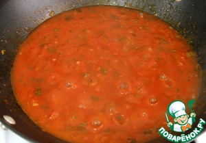Затем добавляем помидоры, томатную пасту, воду, остальное красное вино, соль, перец, красный перец (по желанию) и травы. Доводим до кипения, уменьшаем огонь и готовим 15 минут.