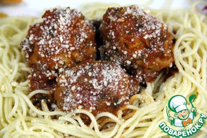 При подаче кладем мясные шарики на спагетти, поливаем соусом и посыпаем сыром.