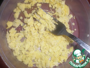 Желтки вынуть и в отдельной посуде хорошо размять вилкой.