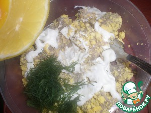 Смешать с майонезом и желтками. Добавить лимонный сок, рубленый укроп, посолить, поперчить и хорошо перемешать. Убрать массу в холодильник.