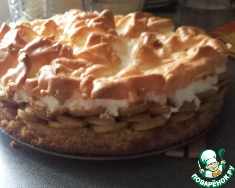 На корж выкладываем кружочки яблок (если яблоки твердые, их можно немного протушить в сахарном сиропе) и сверху выкладываем белковую пену.