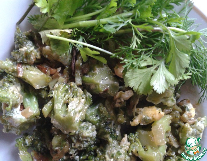 К луку добавить брокколи, посолить, поперчить. Жарить минут 10-15 на среднем огне.