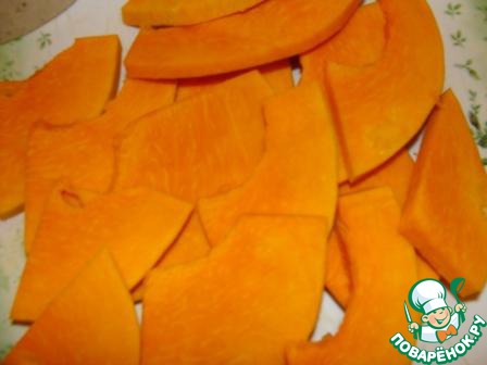 Тыкву вымыть, обсушить, отрезать необходимый кусок, нарезать его на пластинки толщиной 3-4 мм, очистить у каждой кожуру (так легче, нежели чистить весь кусок целиком).