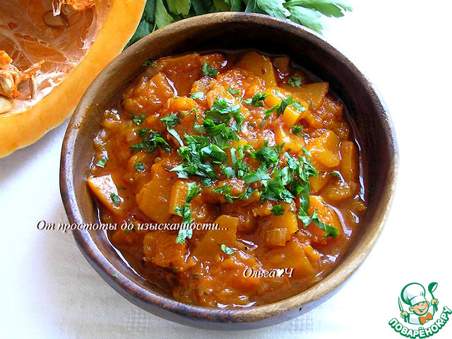 Тыкву подавать тёплой с томатным соусом, посыпав зеленью, с чёрным хлебом. Хороша с белым вином и как гарнир к мясу. Приятного аппетита!
