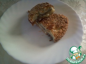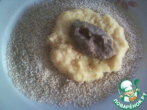 Натираю на мелкой тёрке сыр, осторожно смешиваю его с панировочными сухарями или любой крупой, измельчённой в кофемолке. Выкладываю на плоскую тарелку или листик. Беру картофельный шарик, укладываю на панировку. Ложкой делаю его плоским, но не тонким. Сверху фарш. Осторожно формую пирожки.