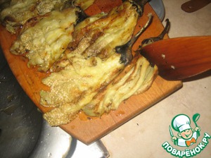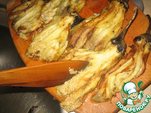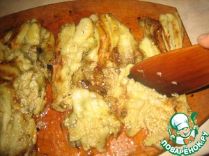 Деревянной лопаточкой как бы "надрезаем" мякоть баклажанов, раскладываем их "веером".