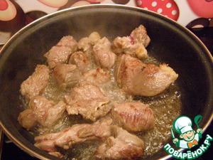 Нарезаем баранину кусочками и обжариваем до золотистой корочки на смеси масел - оливкового и сливочного.