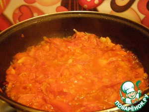 Помидоры очищаем от шкурки, режем кубиками и добавляем к овощам с салями. Туда же добавим сливки, вино и томатную пасту, соль. Тушим 5 минут.