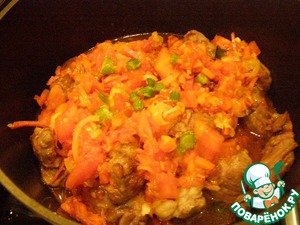 Складываем баранину в жаропрочную посуду, сверху выкладываем соус и нарезанный корень сельдерея. Закрываем крышкой и ставим в духовку на 2 часа.