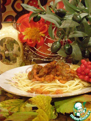 Отвариваем спагетти (или любую другую пасту) в подсоленной воде с ложкой оливкового масла. Выкладываем на тарелку, сверху - баранину с соусом.