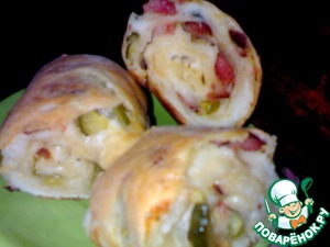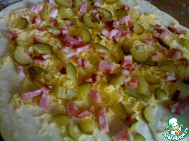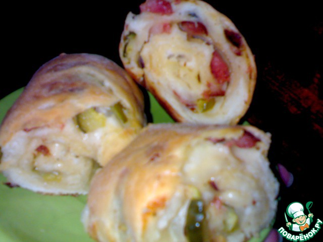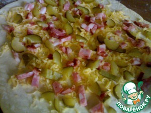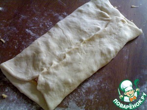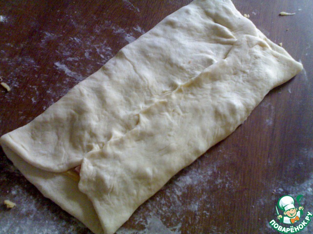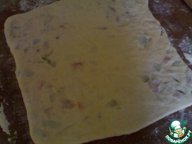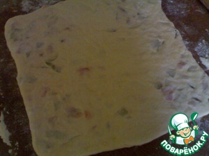 Как тесто поднимется, раскатать его на засыпанном мукой столе. Раскатать скалкой в квадрат. В середину положить сыр (чтоб края остались пустые), колбасу, огурец.