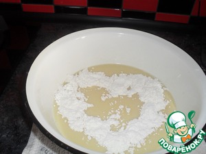 4) Когда размешали все ингредиенты, то добавляем постепенно муку с разрыхлителем и хорошо перемешиваем, чтобы не было комочков.