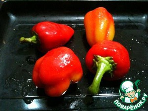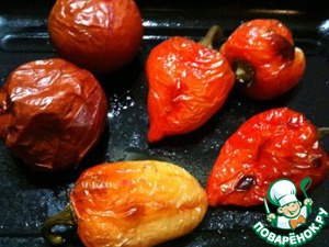 Болгарский перец и помидоры помыть. Перец наколоть вилкой в нескольких местах, слегка смазать растит. маслом и поставить запекаться в духовку при t 200*. Через 15мин. вынимаем противень, кладем помидоры и отправляем снова в духовку. Еще минут на 15, время запекания зависит от вашей духовки.