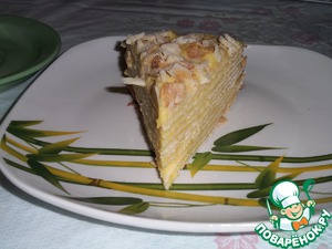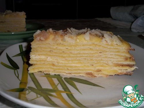 Домашний торт с приятным, нежным заварным кремом, приготовлен по рецепту "Наполеона", который был выбран на сайте, но на вкус похож на слоеный торт, цвет крема насыщенный жёлтый, так как использовались деревенские куриные яйца