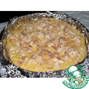 Kак торт будет собран, сверху посыпаем крошкой, накрываем фольгой и на ночь в холодильник.