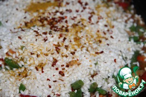Соль, перец, ниточку шафрана, все перемешать, чтоб рис не пригорел
