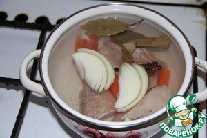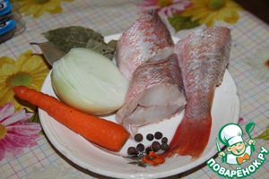 Начнем! Для начала нам понадобится рыба, лук, морковь, лавровый лист и перец душистый