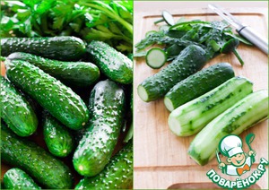 Обработка овощей всегда начинается с того, что мы их тщательно моем. Если огурцы у вас молоденькие, с тонкой кожицей, можно их не очищать. Грубую кожицу необходимо снять. |