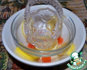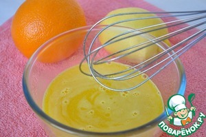 На соковыжималке выдавила сок 2 апельсинов и одного лимона, я люблю горчинку, поэтому шкурку не счищала. Можно купить готовый сок, но я предпочитаю делать это сама.