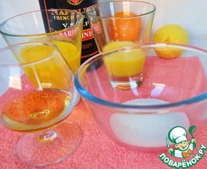 В мисочке перемешать сахар с коньяком и соком до полного растворения и поставить в холодильник охлаждаться.