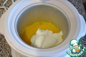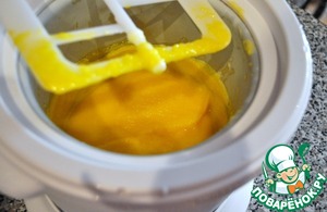 Для приготовления сорбета я воспользуюсь мороженицей. В предварительно замороженную чашу выливаю сок и белки.