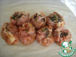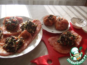Приготовить начинку: грибы обжарить с луком, яйца натереть на мелкой тёрке, нарезать чернослив и зелень, измельчить орехи и чеснок, всё перемешать