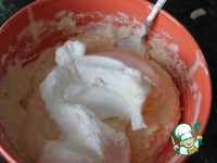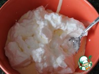 Кo взбитым желткам добавьте примерно 2/3 взбитых белков. Смешивайте желтки и белки очень аккуратно, складывающими движениями. |