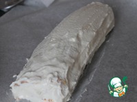 Закручиваем рулет и обмазываем его оставшимся творожным кремом со всех сторон. |