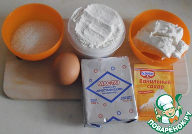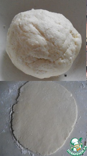 Масло растереть с мукой, смешать с творогом. Добавить щепотку сахара и соли. Вымесить.