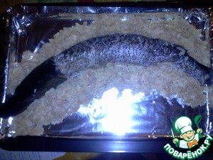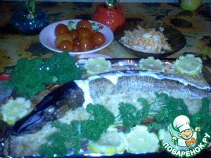 Набить шкуру фаршем, выложить на противень, пришить голову; оставшийся фарш выложить вокруг рыбы и все поставить в духовку на 30-40 мин.