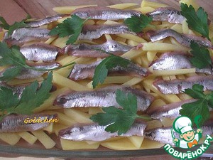 Огнеупорную форму смазываем сливочным маслом. Выкладываем сначала слой картофеля, затем слой лука (лук можно предварительно обжарить, я не обжаривала), слой анчоусов. И так 2 раза.