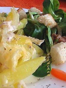 Салат сделала из Feldsalat -"валерьянница". Поджарила с белого хлебa греночки, в соус к салату положила чеснок, бальзамический уксус, оливковое масло, и ещё у меня оставалось со вчера немного копчёного шпика, тоже добавила в салат.