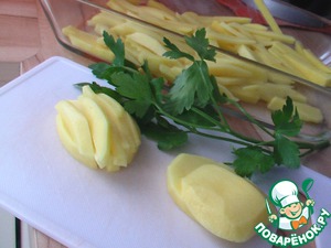 Картофель чистим, моем и режем, как на картошку фри - полосочками. Лук тоже чистим и режeм полукольцами.