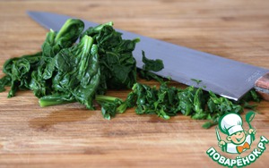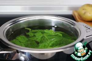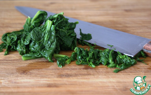 • Бланшировать в кипящей воде листья шпината до мягкости, воду слить и обдать шпинат холодной, ледяной водой. Такой прием позволит сохранить яркий цвет зелени. После чего шпинат хорошо отжать, избавляясь от лишней влаги.