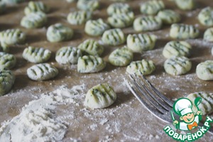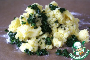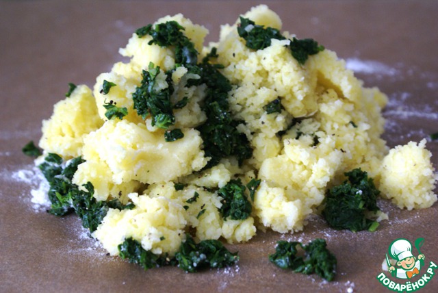 • На поверхности, присыпанной мукой, смешать картофельную массу со шпинатом, добавить соль, перец по вкусу и хорошо вымесить, добавляя муку по необходимости. Полученная масса не должна быть очень тугой, но при этом не должна липнуть к рукам. (На этой стадии также можно добавить яйцо, оно послужит хорошим закрепителем, и его использование часто встречается в подобных рецептах).