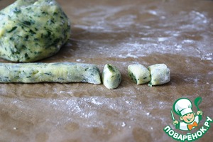 • Разделить массу на части и скатать нетолстыми колбасками. После чего нарезать колбаски кусочками толщиной в палец.