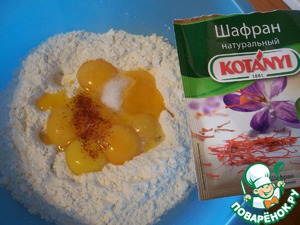 В емкость просеять муку (если нет времени, я не сею), сделать в ней воронку, вылить туда желтки, всыпать соль и шафран.