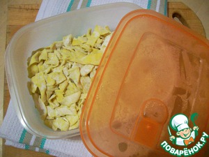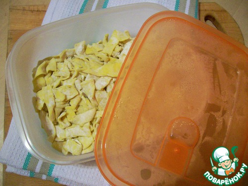 Коротенькую лапшу я сложила в пластиковый контейнер и заморозила. Складывайте ее, как бы насыпая, ни в коем случае не утрамбовывайте.