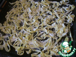 Дальше длинную лапшу я положила сушиться на противне. Вообще, если вы хотите получить высушенную лапшу, ее нужно сушить минимум сутки в хорошо проветриваемом сухом помещении. Но мне больше нравится не сушеная, а свежая лапша, она более нежная.