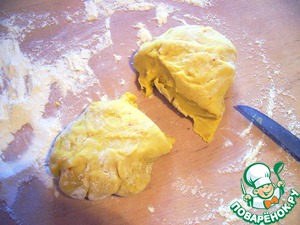 Затем присыпаем рабочую поверхность мукой, выкладываем наш колобок и разрезаем его пополам для удобства раскатывания.