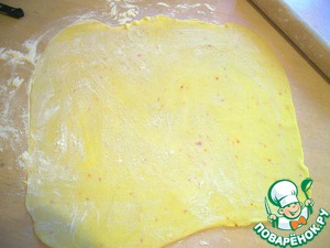 Обильно посыпая мукой, раскатываем одну половинку до толщины 1 мм. Тесто очень послушное, мягкое и податливое, раскатать его не составляет никакого труда.