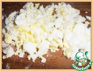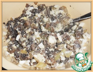 Смешиваем в миске грибы с луком и яйца. Хорошо перемешиваем. Начинка готова.