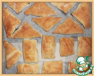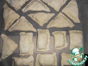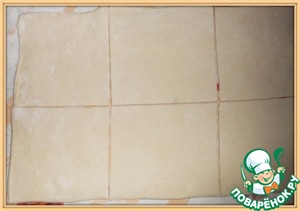 Тесто раскатываем не сильно тонко и разрезаем на квадраты.