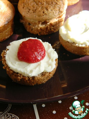 На одну половинку нанести крем, затем ложку ягоды, и снова крем. -